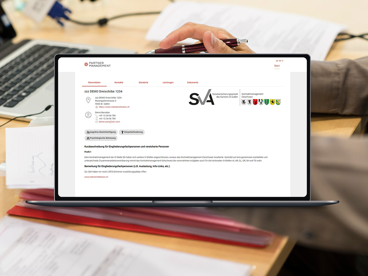 Über 40 Kontraktmanager in den einzelnen IV-Stellen arbeiten tagtäglich mit dem neuen Tool. Sie vereinbaren die Verträge und Rahmenbedingungen mit den Leistungserbringern. Bei diesen handelt es sich um Leistungserbringer aus verschiedensten Branchen, die Ausbildungsplätze und/oder Unterstützung für Personen mit gesundheitlicher Einschränkung zur Verfügung stellen. Die SharePoint-Lösung von 2sic ermöglicht den Kontraktmanagern das einfache Erfassen neuer Partner und die Pflege bestehender Partner. Zu jedem Partner sind zentral und übersichtlich alle Dokumente wie Verträge und Informationen zu Kontaktpersonen sowie Leistungen hinterlegt. Die Partnerübersicht in SharePoint ist jederzeit auch von unterwegs aufrufbar.
