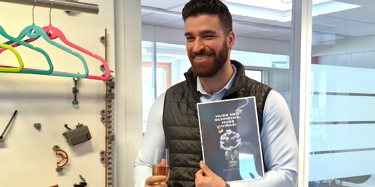 Als Fitness-Freak und Kraftsportler ist er eine Motivation für einige im Team. Das hat uns dazu animiert ihm neben dem Diplom, ein (Hall of Fame-Poster) zu erstellen als "stärkster Lauch im GYM". Wir wünschen ihm noch lange Freude an der Hingabe zu Muskelkater und Protein-Shakes. Denn, seien wir ehrlich, hinter jedem Löffel Chia-Samen und jeden Schluck Grünkohl-Smoothie steckt ein Kriegerherz, das nach Erfolg (und vielleicht nach einem Döner) schreit. :-D